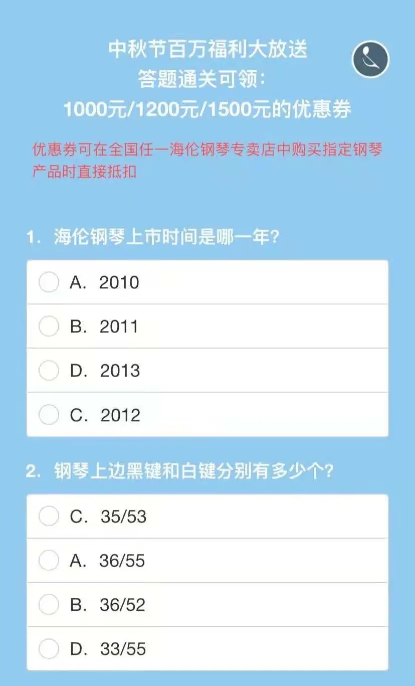 在文內識別上述二維碼直接開始進行答題或者關注“海倫鋼琴”官方微信公眾號,回復關鍵詞“優(yōu)惠券”,獲取答題鏈接;